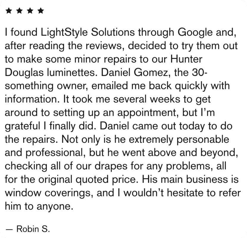 Say goodbye to generic blinds—Light Style Solutions offers custom designs, motorized convenience, and expert installation with a lifetime guarantee.